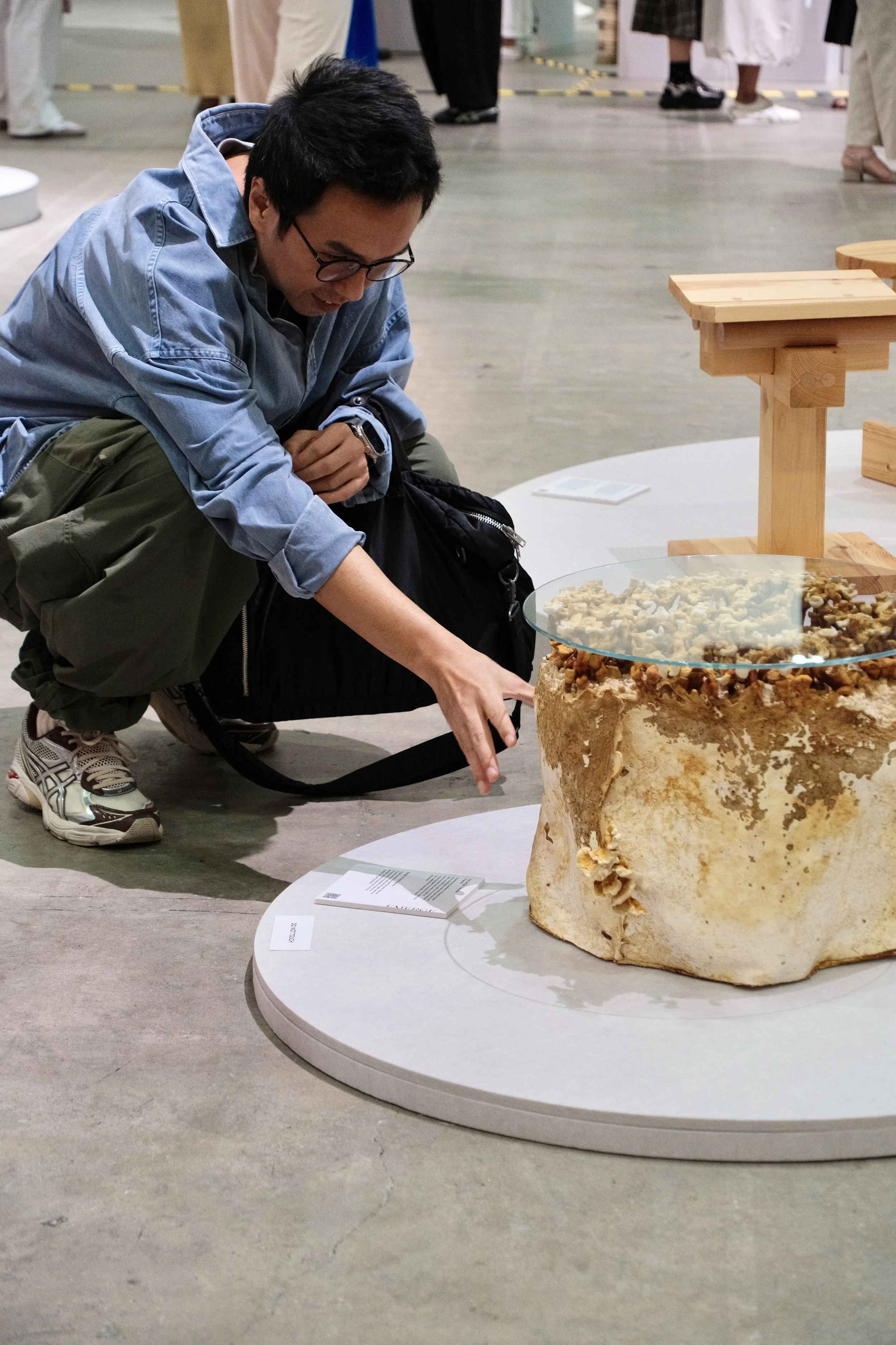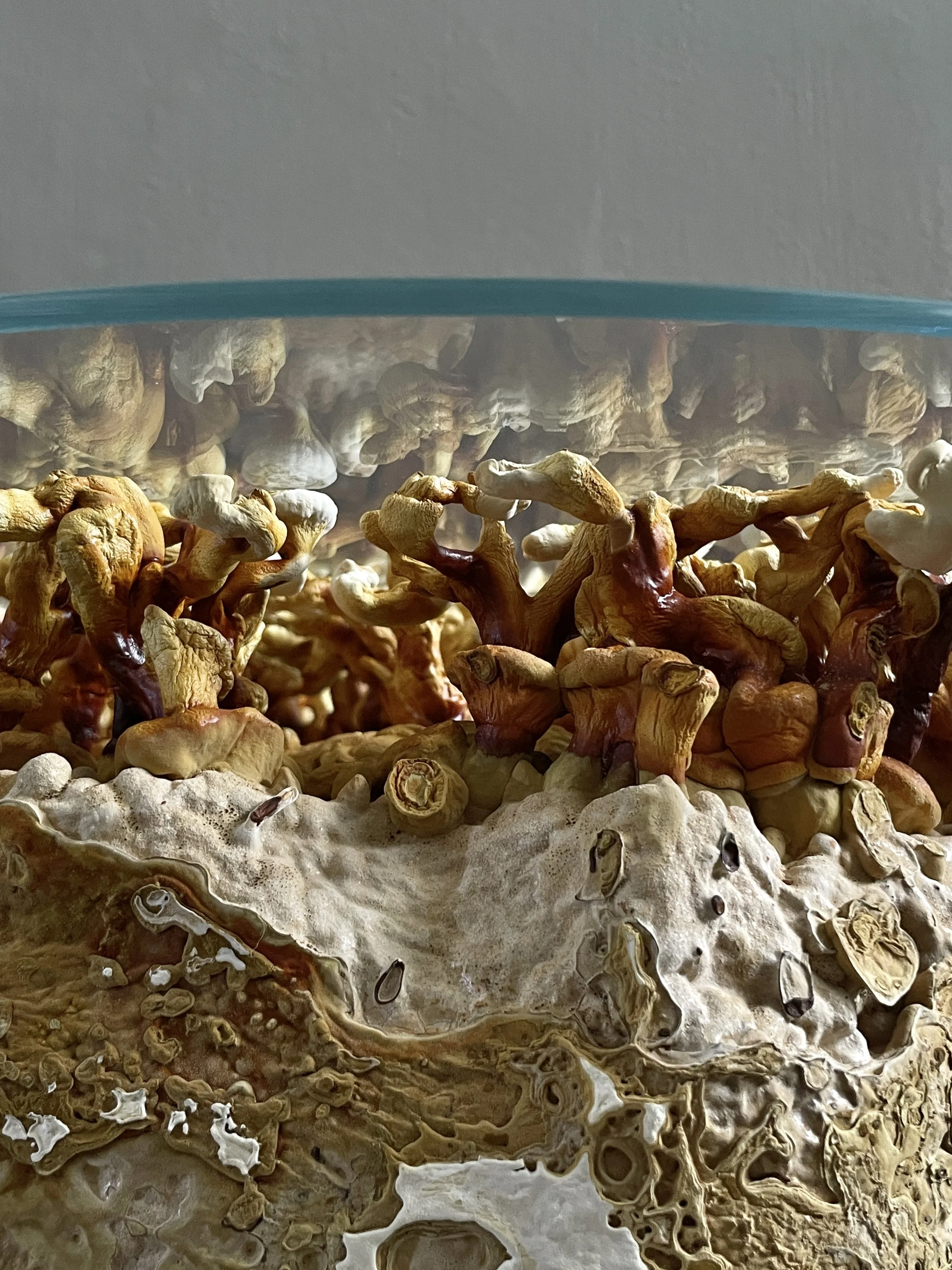 This mycelium table showcases mushroom fruitbodies as a support structure to hold up a crystal glass top.